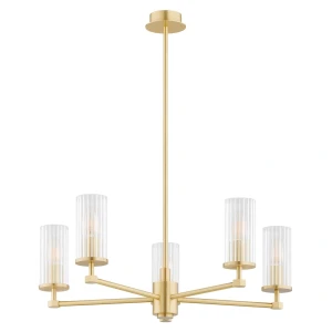 Oświetlenie potrafi całkowicie odmienić charakter wnętrza, a żyrandol Hampton 62 jest tego doskonałym przykładem. Ten elegancki żyrandol z mosiądzu wyposażony w pięć szklanych ryflowanych kloszy to idealny wybór do salonu, pokoju dziennego, kuchni czy nad stół w jadalni.