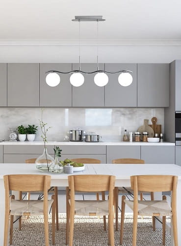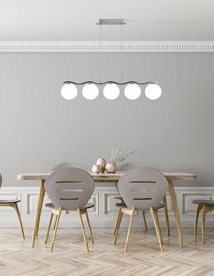 Seria lam wiszących Ramon w kolorze chrom z białymi mlecznymi kloszami. Delikatnie falowane pozioma belka-listwa wisząca na regulowanych linkach, do której mocowane są gniazda na żarówki G9 i klosze lampy. Oświetlenie stref wypoczynkowych, stołów w jadalni czy też przestrzeni pokoju. Lampy znajdą zastosowanie również w pomieszczeniach innych niż mieszkalne.